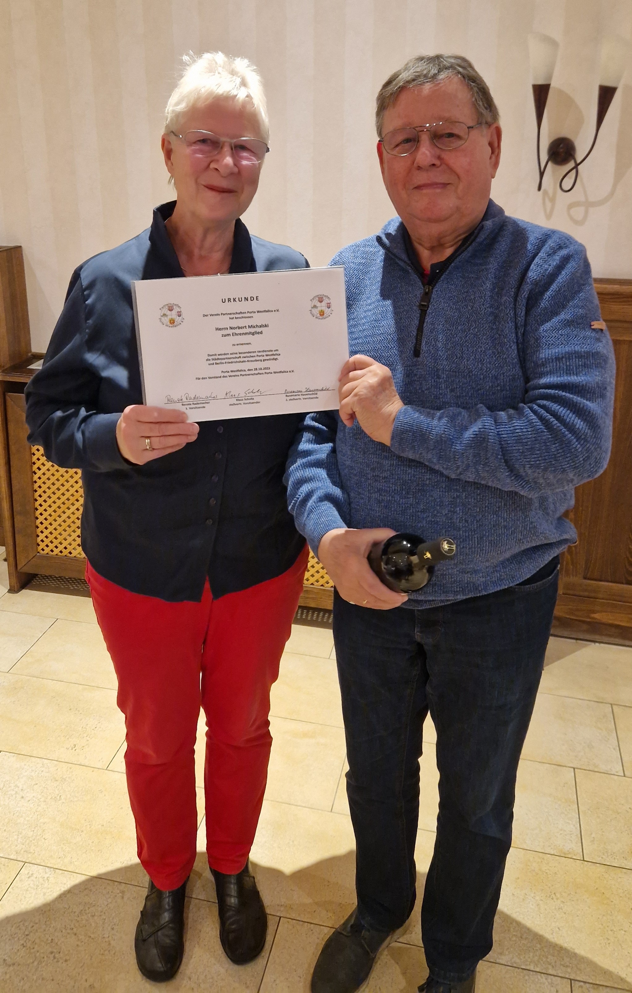 Zum Abschluss trafen wir uns zum gemütlichen Abendessen im Weserschiffchen. Bei der Gelegenheit hat der Partnerschaftsverein den Vorsitzenden des PV Friedrichshain-Kreuzberg, Norbert Michalski zum Ehrenmitglied ernannt, zum Dank für seine unermüdlichen Bemühungen um die Partnerschaft.